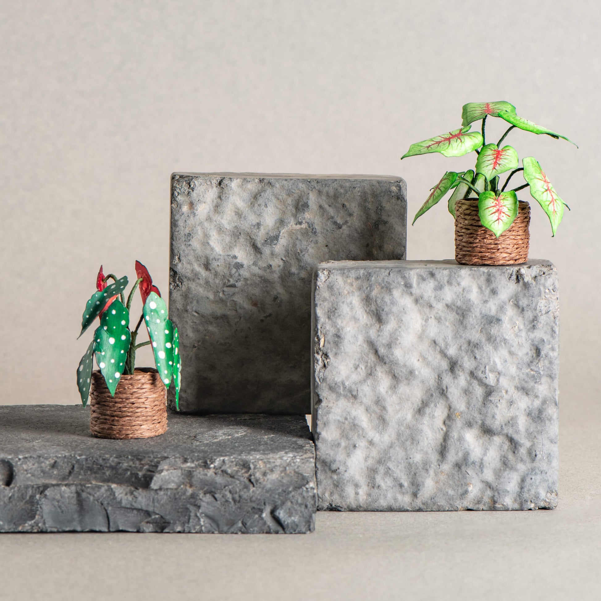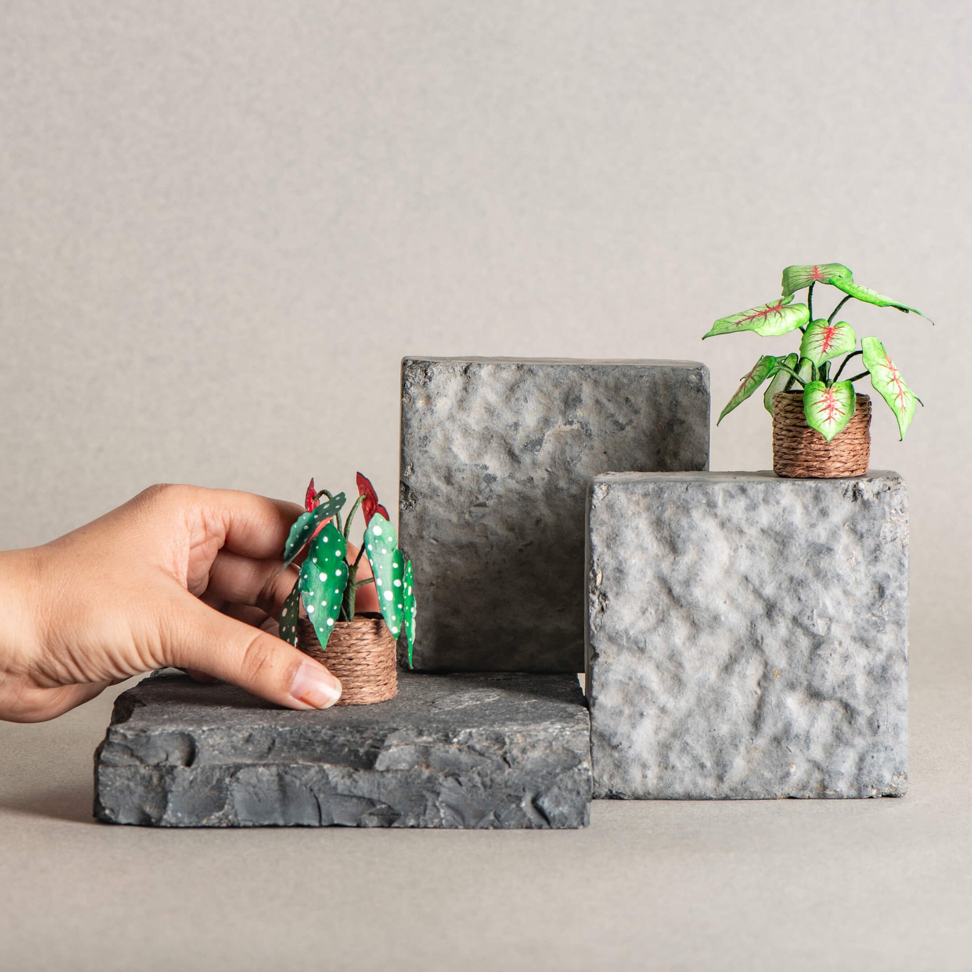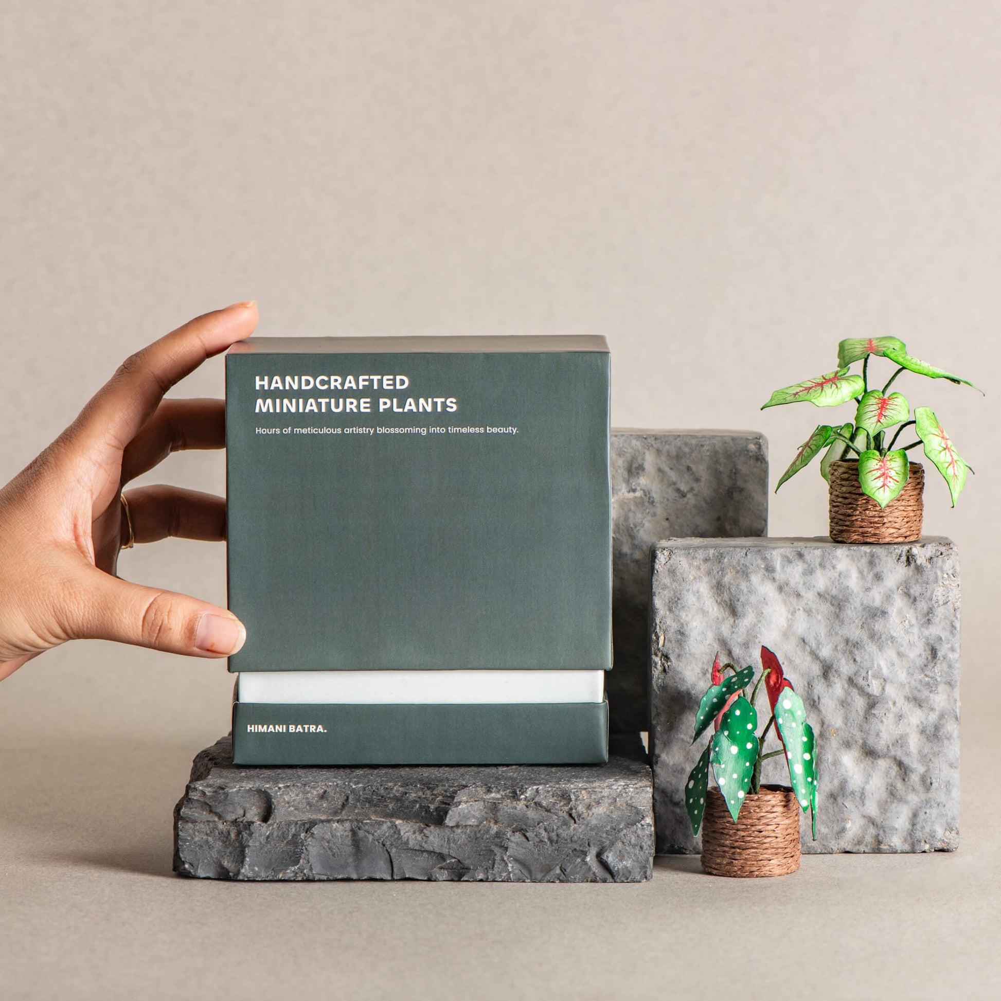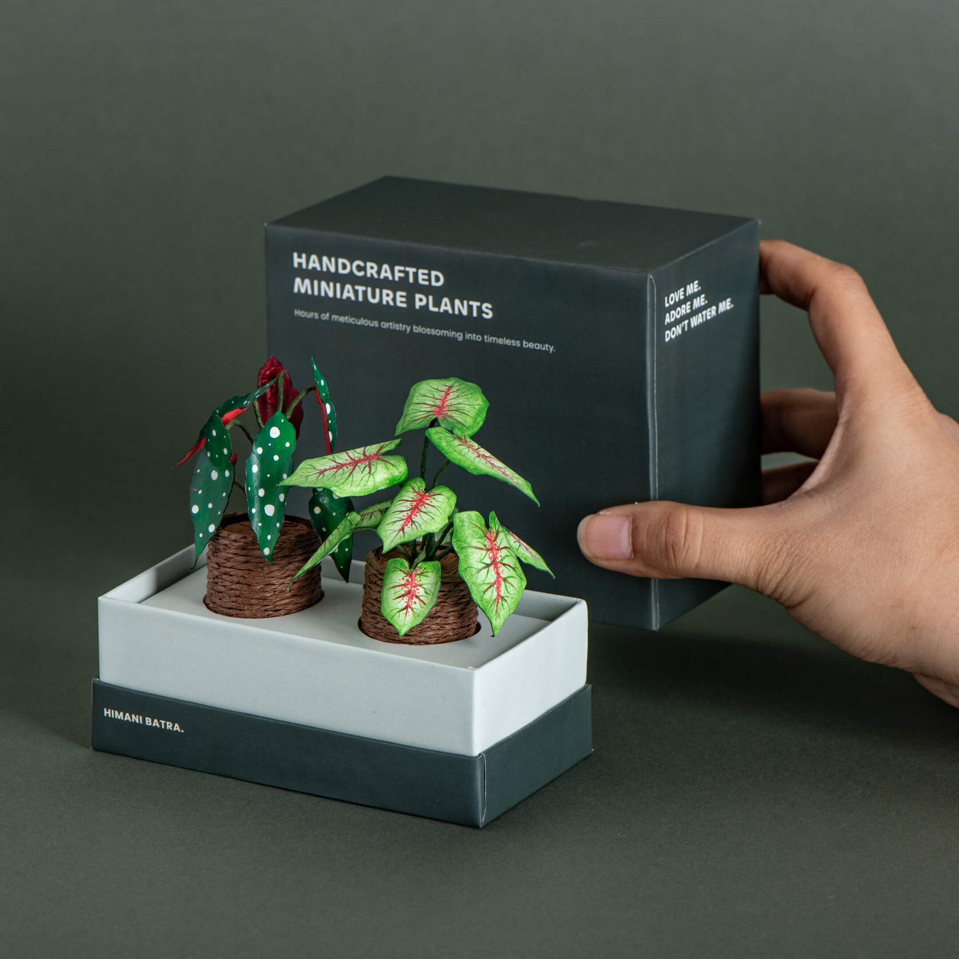 Set up a cozy corner with handcrafted miniature paper plants. This product comprises of miniature paper caladium and polka dot begonia. Each leaf of the plant is carefully cut, hand painted and assembled in a paper cord pot to add a whimsical charm to your space.